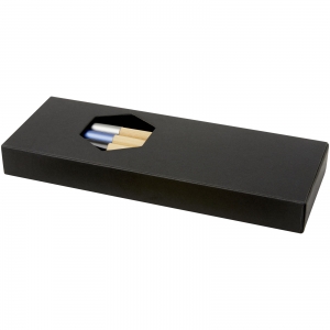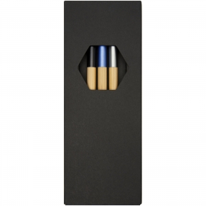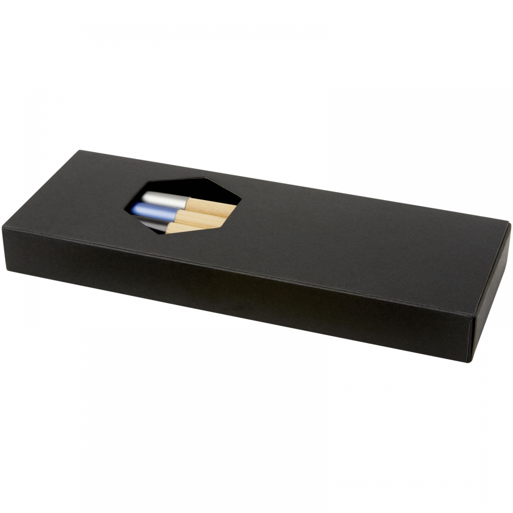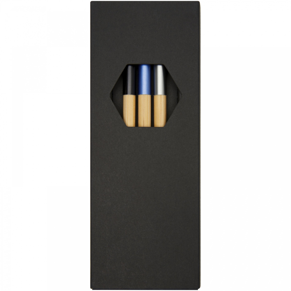 Artikel-Nr: CPO10777990Kugelschreiberset mit exklusivem Design, bestehend aus drei Kugelschreibern mit Farbakzent. Der Kugelschreiber mit der blauen Aluminiumplatte ist mit einer blauen Mine bestückt, während die beiden anderen Stifte mit einer schwarzen Mine bestückt sind. Verpackt in einer schwarzen Geschenkbox.