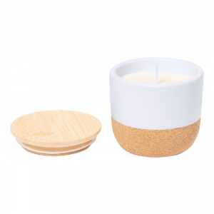 Artikel-Nr: AND733718-01Pflanzliche Wachskerze mit Vanilleduft in einem Keramikhalter mit Naturkorkboden und Bambusdeckel.