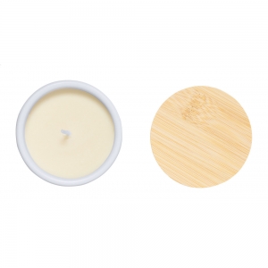 Artikel-Nr: AND733718-01Pflanzliche Wachskerze mit Vanilleduft in einem Keramikhalter mit Naturkorkboden und Bambusdeckel.