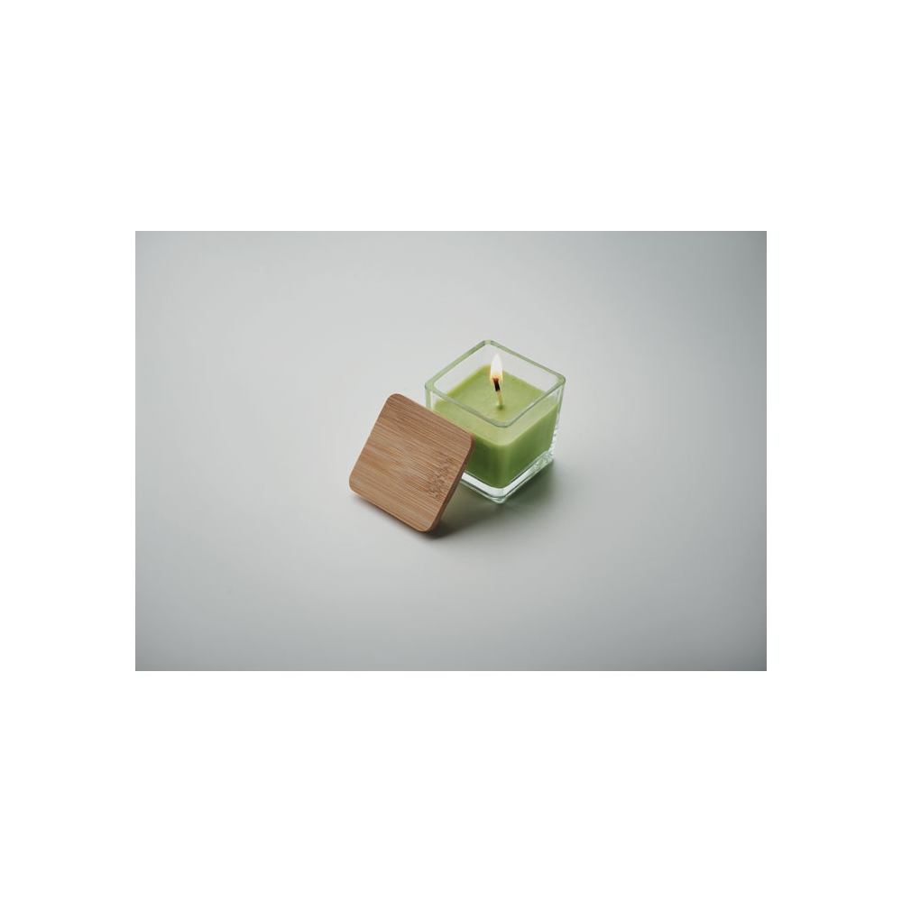 Artikel-Nr: OCBMO2235-48Kerze im rechteckigen Glas mit Deckel aus Bambus. Wachs auf pflanzlicher Basis. Unterschiedliche Düfte. 50 g. Brenndauer: 8 Stunden.