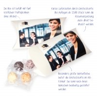 Artikel-Nr: 49430138Attraktive Kissenverpackung mit einer Mischung aus sechs Trüffelpralinen ohne Alkohol (jedes Stück einzeln verpackt). Die Kissenverpackung kann mit einem individuellen Folder/einer Klappkarte unternehmens- oder aktionsbezogen gestaltet werden. Der Folder wird in die Kissenverpackung geschoben und ist durch die beiden Fenster der Verpackung sichtbar. Eine beidseitige Werbeanbringung ist möglich.