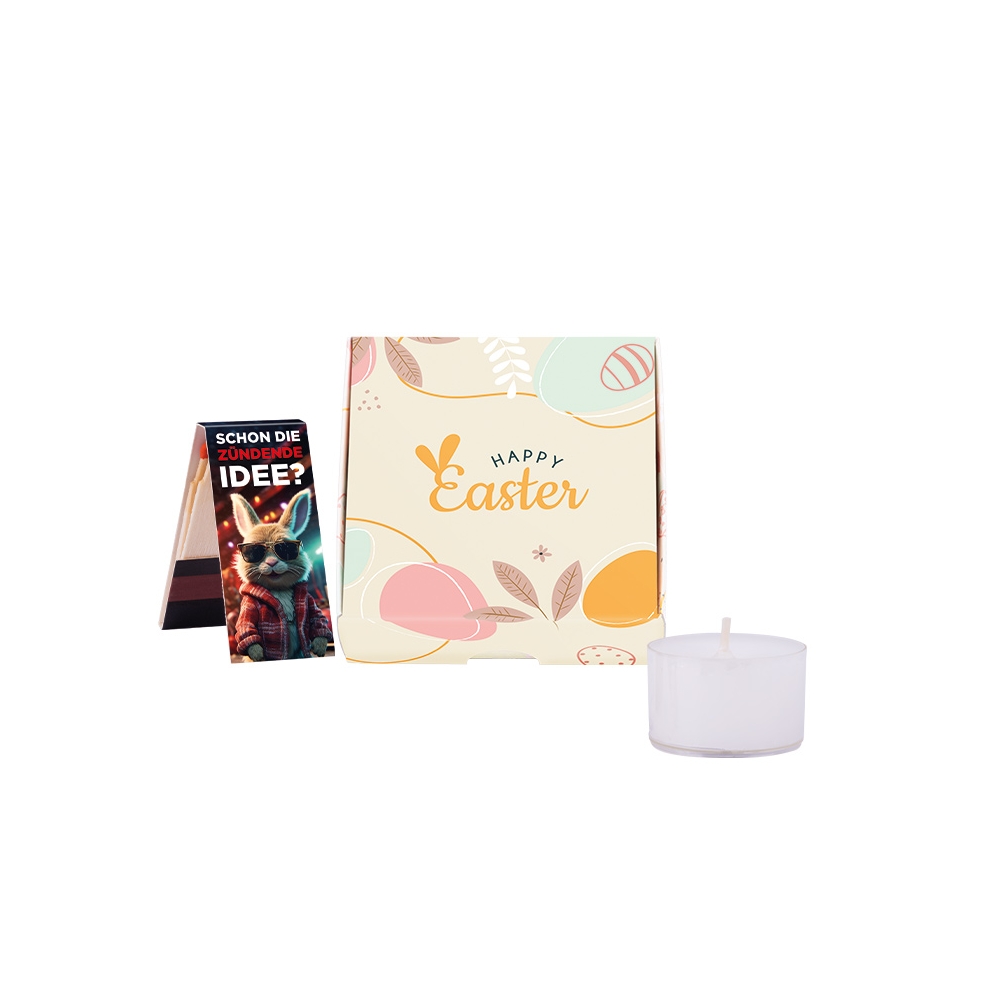 Artikel-Nr: PUC1269.00009Kleine Klappbox aus weißem Karton, individuell bedruckt. Inhalt: 4 Teelichter und 1 Streichholzbriefchen in einer Standardgestaltung für Ostern, 90 g