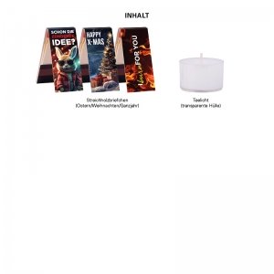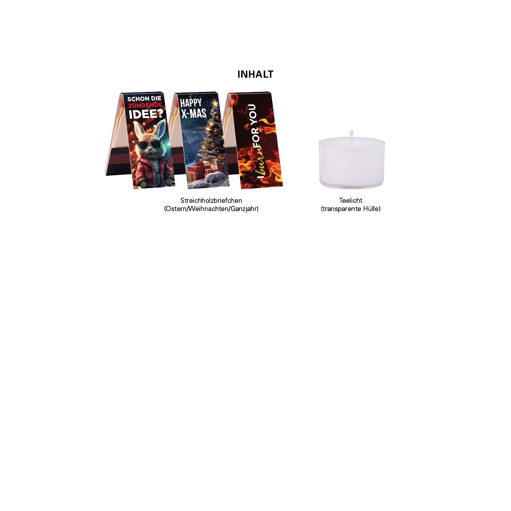 Füllvarianten: 4 Teelichter und 1 Streichholzbriefchen, Ostermotiv oder 4 Teelichter und 1 Streichholzbriefchen, Weihnachtsmotiv oder 4 Teelichter und 1 Streichholzbriefchen, Standardmotiv