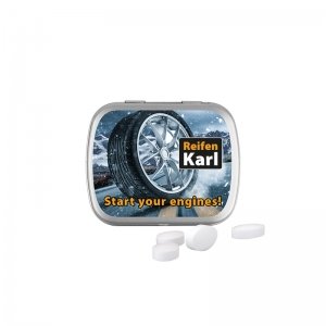 Artikel-Nr: PUC1015.00024Scharnierdeckeldose mit gewölbtem Deckel, matt-silber aus Metall, individuell bedruckt. Mit Originalitätsverschluss und Aufreißperforation, Weißblech 98% recycelbar. Inhalt: Pfeffi Pfefferminzpastillen, zuckerfrei, 19 g