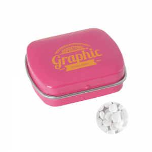 Artikel-Nr: PRM501111_09Kleine Scharnierblechdose, 42 x 33 x 14 mm mit ca. 10 gr. extra strong Minties `Triangle`, verfügbar in vielen Farben, mit Glanzschicht mit verschiedenen Füllungen: Schokoperlen gold, knuspriger Schokoladen festival, knusprige schokoladen Juwelen, goldglitzer Milchschokolade, kleine Herzen gold, kleine Herzen rot / weiß, marmorgold Schoko dunkel, mikro Milchschokoladeneier, mini Schokoperlen gold, mini Schokoperlen kupfer, roseglitzer Milchschokolade, silberglitzer Milchschokolade oder sommerkonfetti Schoko dunkel.
