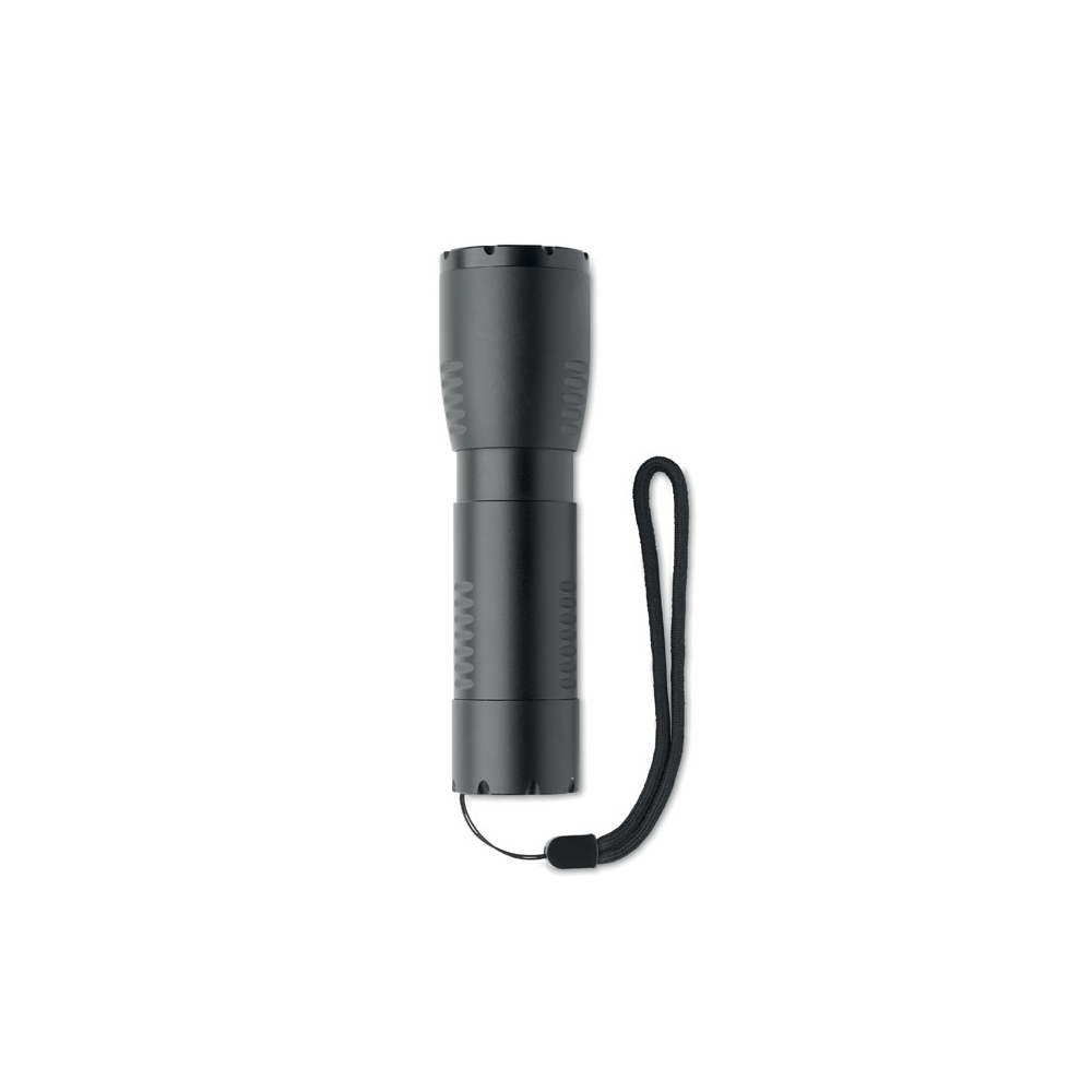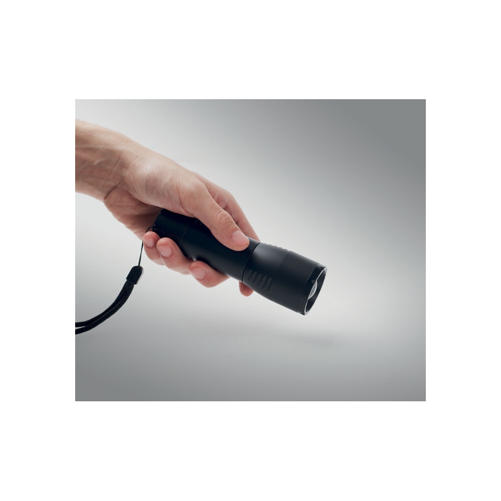 Artikel-Nr: OCBMO6591-03Kleine zoombare LED Taschenlampe aus Aluminium mit abnehmbarer Schlaufe. Leistung: 200 Lumen. Exkl. 3 AA Batterien.