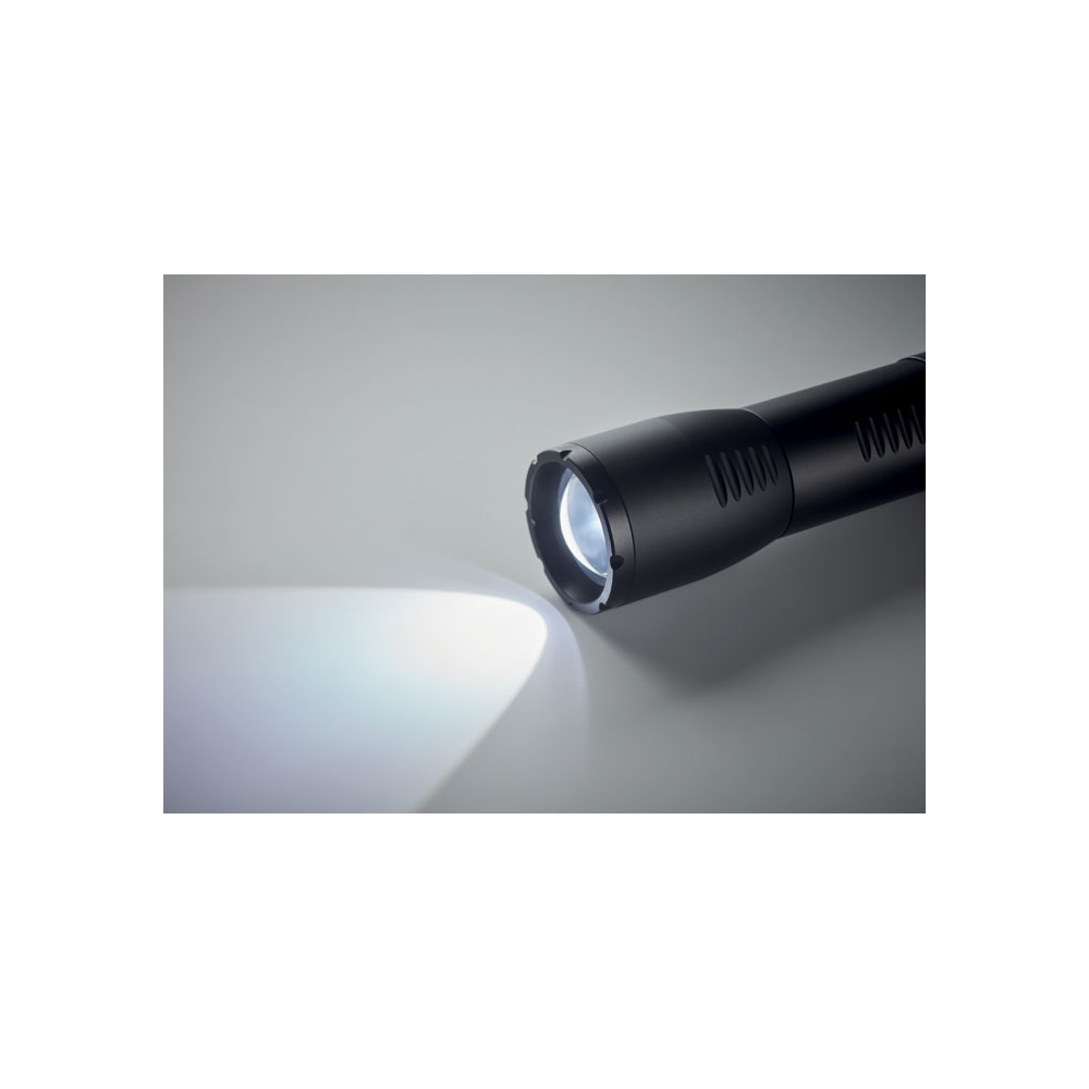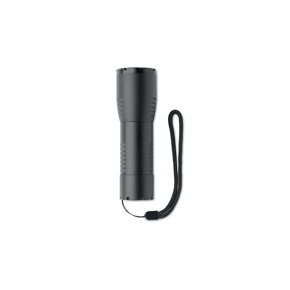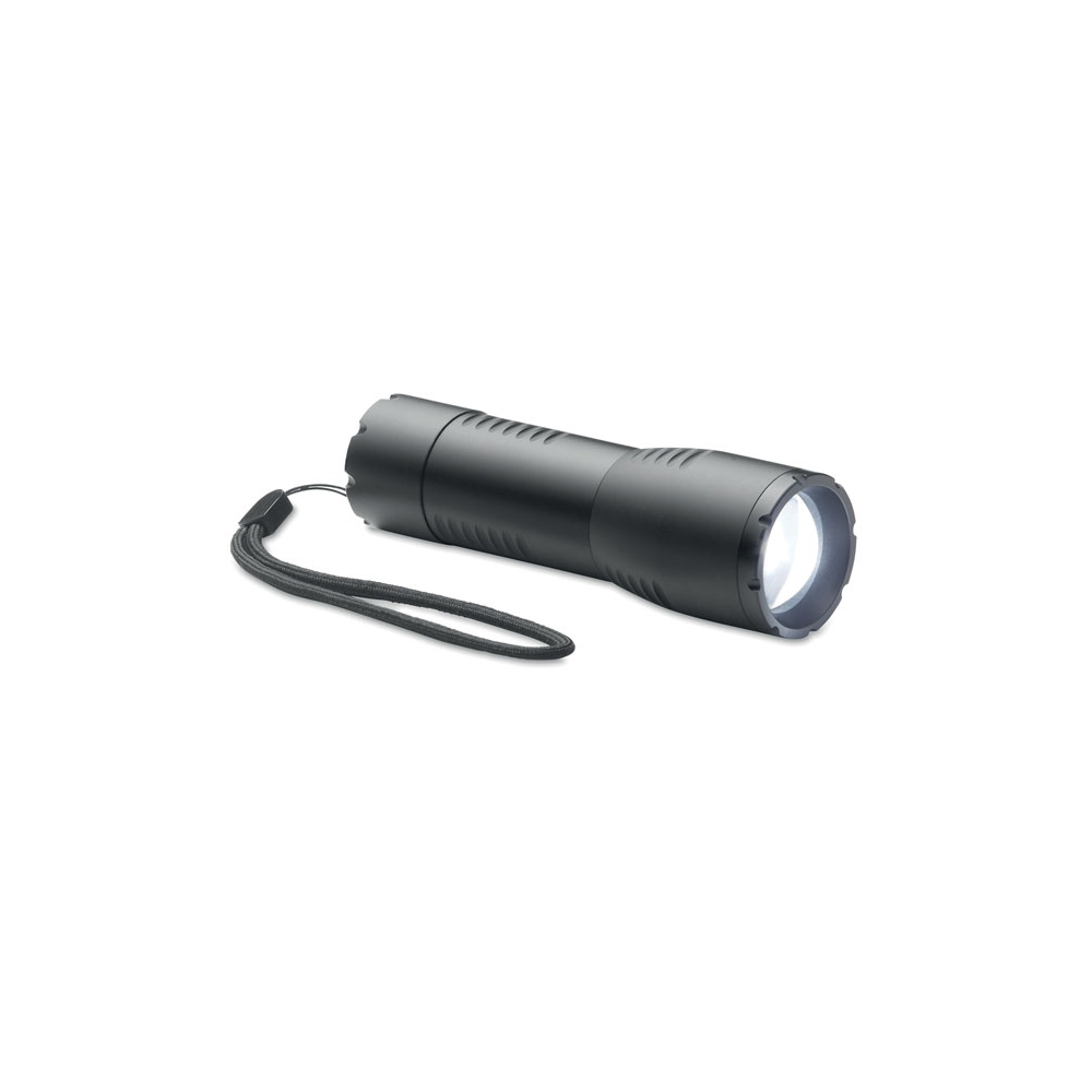 Artikel-Nr: OCBMO6591-03Kleine zoombare LED Taschenlampe aus Aluminium mit abnehmbarer Schlaufe. Leistung: 200 Lumen. Exkl. 3 AA Batterien.