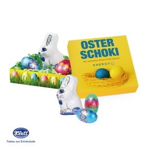Inhalt: Vollmilch Schokoladenmischung (ca. 25 g), bestehend aus 2 Stück Schokoladen-Eiern, bunt gemischt und einem Osterhasen von Klett.