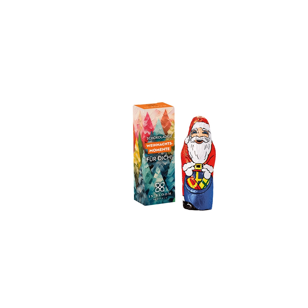 Klett Schokoladen-Weihnachtsmann in kleiner Werbebox aus weißem Karton, individuell bedruckt. Inhalt: 1 Klett Weihnachtsmann aus Vollmilchschokolade, in verschieden farbigen Folie eingewickelt, bunt gemischt, 15 g. Saisonartikel, solange der Vorrat reicht.