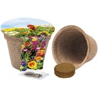 Inhalt: Topf aus Kokosfasern Ø 12, 5 cm mit Erdtabletten und Samen: bunte Blumenmischung