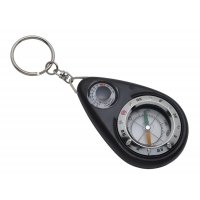 Schwarzer Kunststoff. Maßeinteilung des Thermometers in Celsius und Fahrenheit. Mit Schlüsselanhänger.