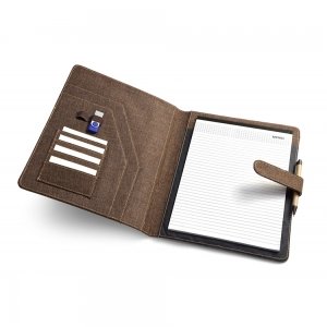 Artikel-Nr: ARD17557A4 Öko-Mappe. 2 große Fächer, 2 USB Fächer, 2 kleine Fächer, Kugelschreiber, Notizblock. Das Logo wird auf dem Öko-Leder-Umschlag graviert. Notizbuch ist nicht dauerhaft fixiert, sondern in die Tasche hineingeschoben, so dass es leicht ersetzt werden kann.