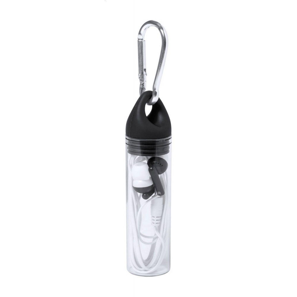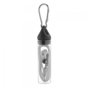 Artikel-Nr: AND781686-10In-Ear-Kopfhörer mit 3,5 mm Audio-Stecker in Kunststoffbehälter mit Karabiner und farblich abgestimmten Deckel.