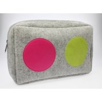 Artikel-Nr: 18829068002Kosmetiktasche aus Filz, 1 Hauptfach außen mit 2 aufgenähten Kreisen wahlweise aus Kunstleder oder Wollfilz 3 mm, ca. 27 x 17 x 6 cm, Wollfilz (ca. 3 mm) naturbelassen (nach Oeko-Tex® Standard 100), gemäß Farbtafel