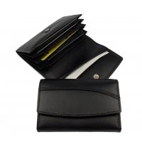 Karten-/Visitenkartenetui, 3 Fächer für je 5 Kreditkarten, Überschlagklappe mit verdecktem Steckfach durch Druckknopf gesichert, ca. 10 x 6,5 cm (geschlossen), Vollrindleder (Padova), schwarz (bzw. auf Anfrage)