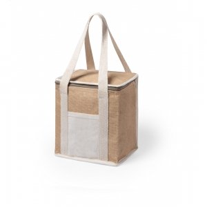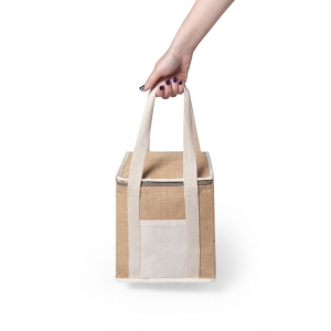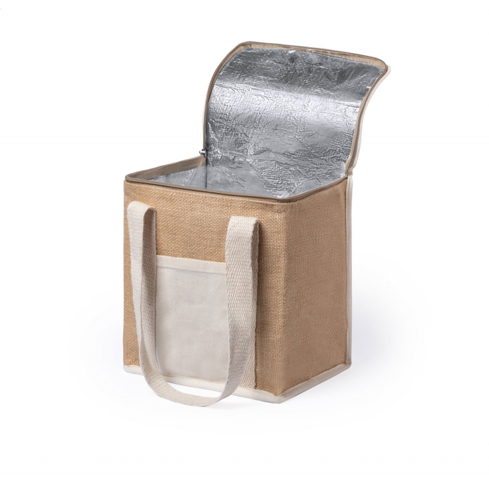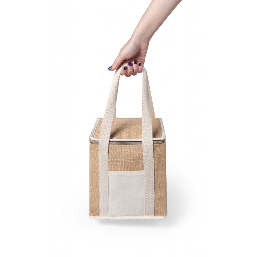 Artikel-Nr: AND721989Reißverschluss-Kühltasche aus laminierter Jute und Baumwolle mit Aluminiumbeschichtung. Mit Vordertasche, ideal für die Bedruckung.