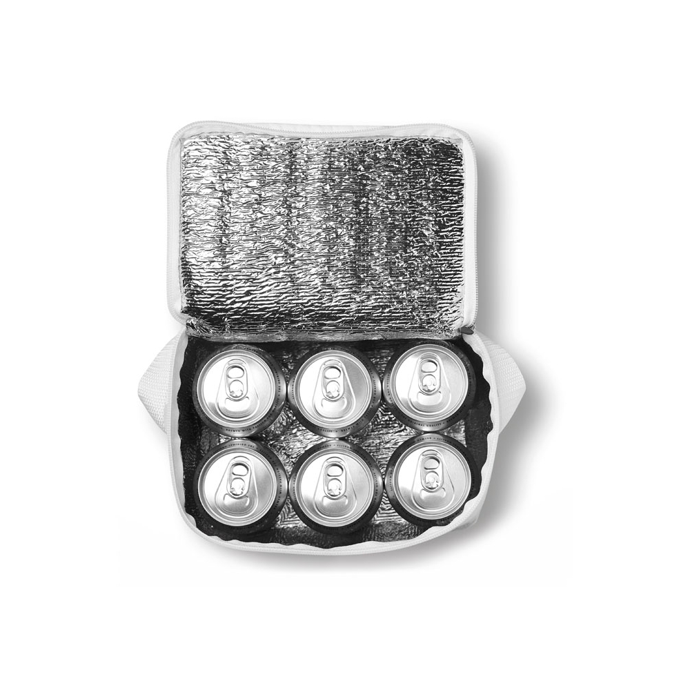 Artikel-Nr: OCBMO8438-06Kühltasche für 6 Dosen. Außenseite 200D Polyester. Mit weißen Absetzungen Non-Woven 80 g / m². Isoliermaterial: Mit Aluminiumfolie laminierter Schaumstoff. Füllmenge 3L.
