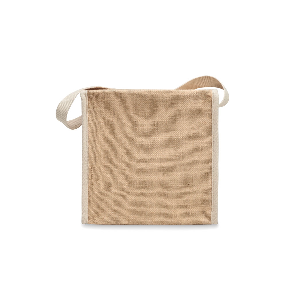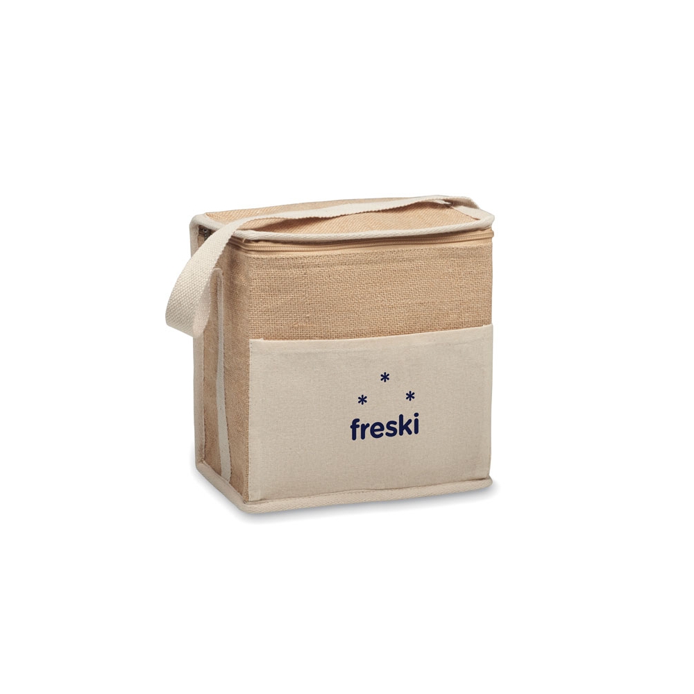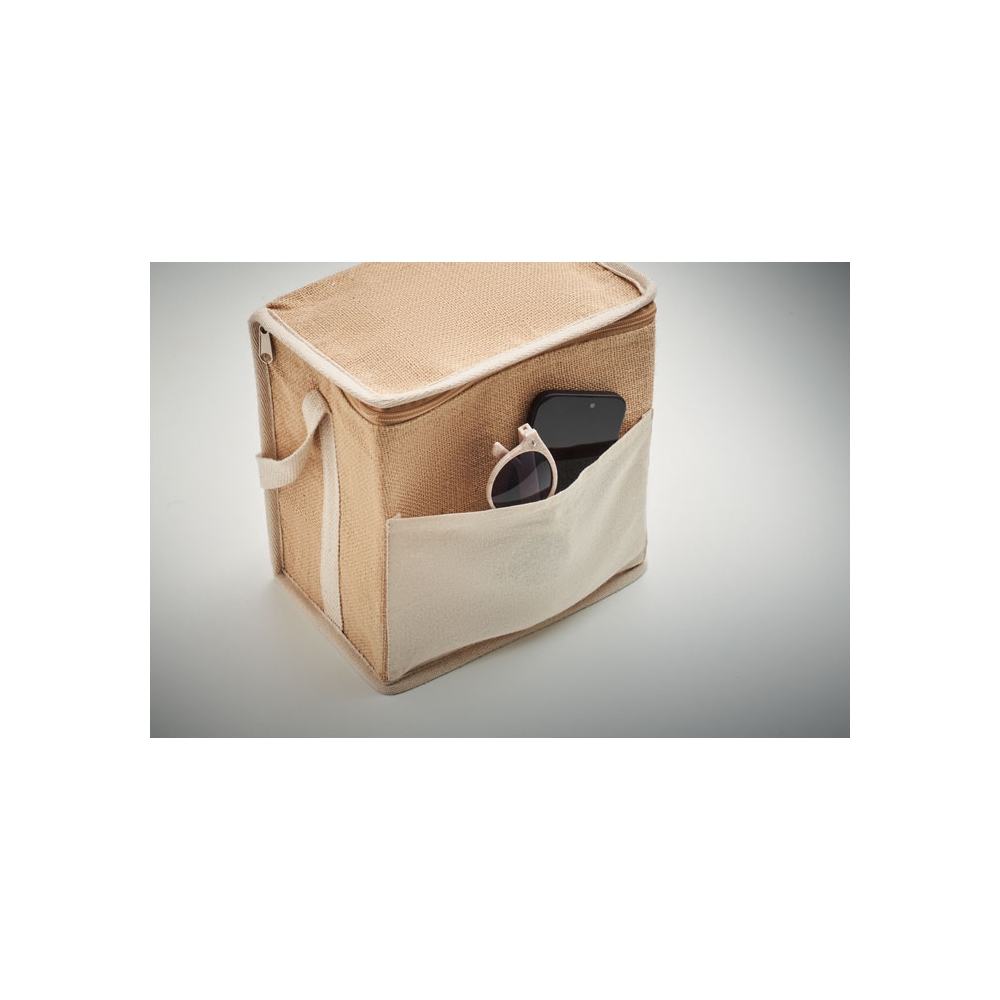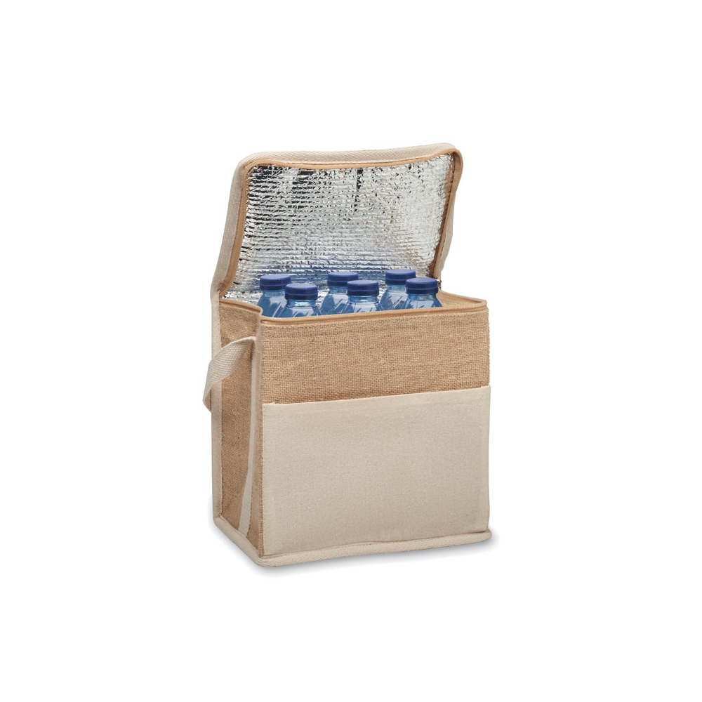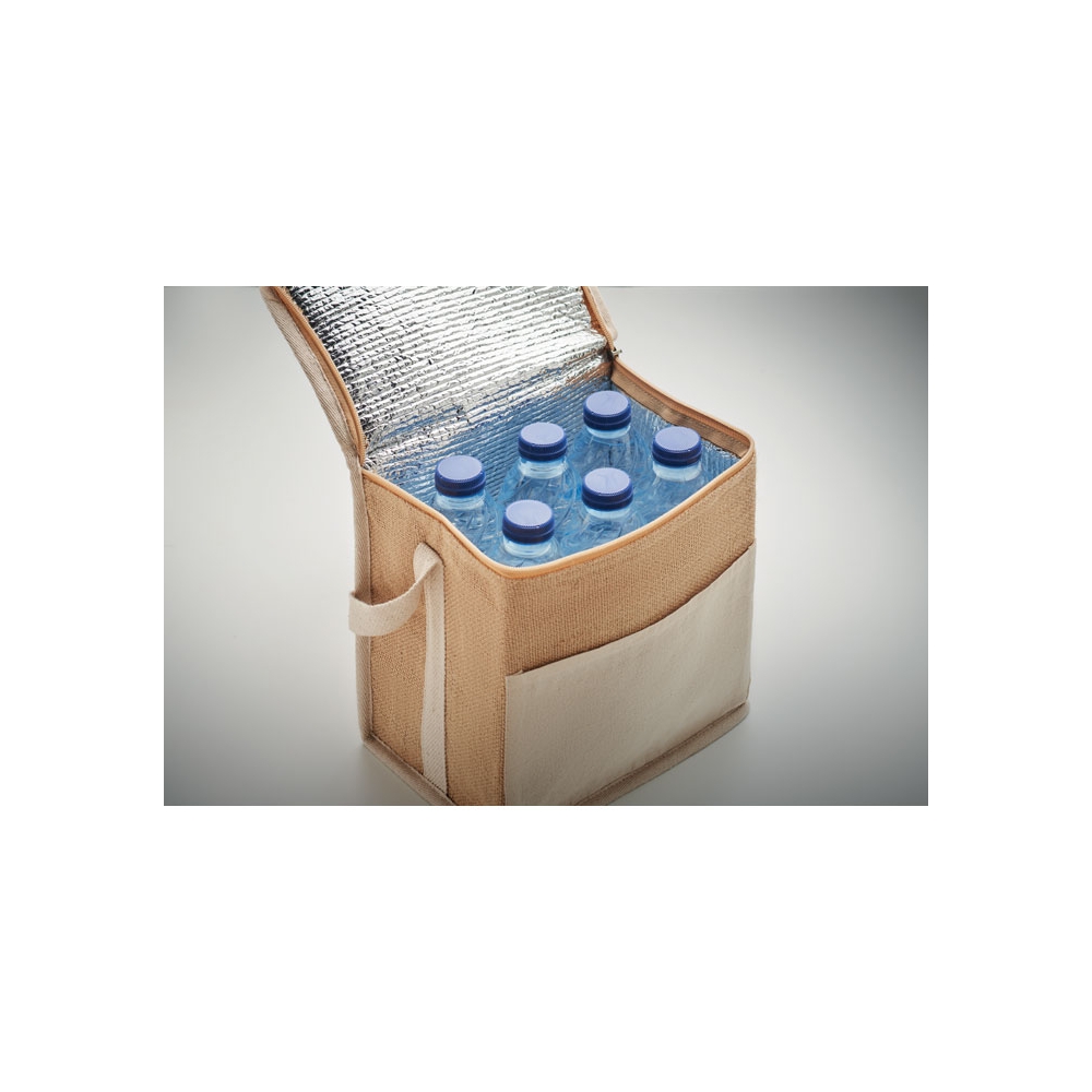 Artikel-Nr: OCBMO2503-13Kühltasche aus Jute mit Fronttasche und Gurt aus Baumwolle. Platz für 6 x 0,5L Flaschen. Isoliermaterial: 3 mm Aluminiumfolie. Füllmenge: 3L.