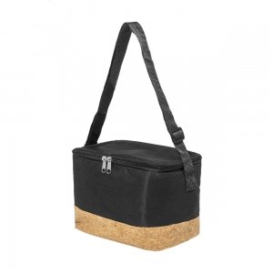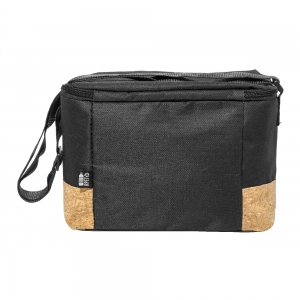 Artikel-Nr: AND800091-10600D RPET-Polyester-Kühltasche mit Reißverschluss, Boden aus Naturkork, PEVA-Polsterung und verstellbarem Schultergurt. Mit RPET-Label.