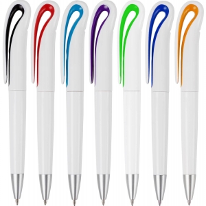 Artikel-Nr: GIV2442001Drehkugelschreiber aus Kunststoff, weiß mit farbigen Akzenten und schwarzer Mine.