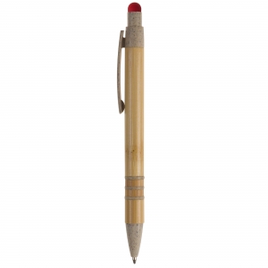 Artikel-Nr: ART87282N5521Kugelschreiber mit Bambusschaft. Spitze, Clip, Drücker und Schaftringe bestehen aus Weizenstroh. Auf dem Drücker befindet sich ein farbiger Stylus zur Smartphone-Nutzung. Ein vielseitiger Werbeartikel, ausgestattet mit einer blau schreibenden Jumbo-Mine.