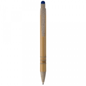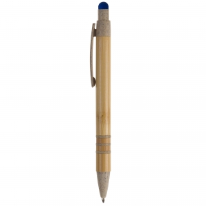 Artikel-Nr: ART87282N5511Kugelschreiber mit Bambusschaft. Spitze, Clip, Drücker und Schaftringe bestehen aus Weizenstroh. Auf dem Drücker befindet sich ein farbiger Stylus zur Smartphone-Nutzung. Ein vielseitiger Werbeartikel, ausgestattet mit einer blau schreibenden Jumbo-Mine.