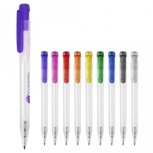 Artikel-Nr: ART87543N5472Frosty Ingeo TM Kugelschreiber mit transparentem farbigem Clip. Ab 5.500 Stück sind eigene Farbkombinationen möglich. Hergestellt aus PLA, einem biologisch abbaubarem Material. Dies bedeutet, dass es eine gute und umweltfreundliche Wahl als Werbeartikel ist. Ausgestattet mit einer blau schreibenden X20-Refill-Mine. Der Druckkugelschreiber besteht aus ABS und wird in Europa hergestellt. Ab einer Abnahmemenge von 5.000 Stück sind eigene Farbkombinationen möglich.