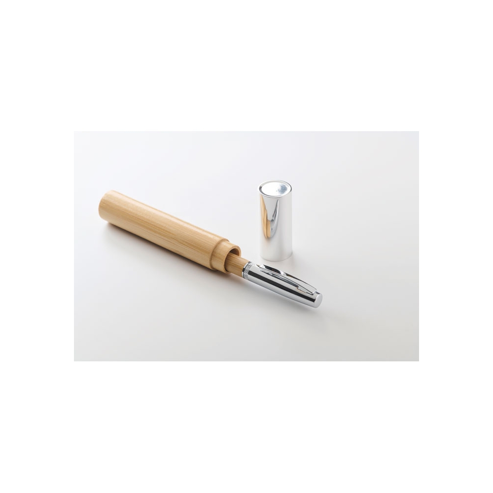 Artikel-Nr: OCBMO2511-40Drehkugelschreiber aus Metall mit Schaft in Bambus-Finish. Lieferung in einer Hülse aus Bambus mit Kappe aus Aluminium. Blaue Tinte.