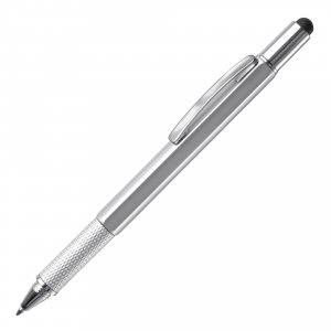 Artikel-Nr: ART87797N0005Multifunktionaler Kugelschreiber mit Touchspitze, inklusive Wasserwaage, Schraubendreher und Lineal. Blauschreibend.