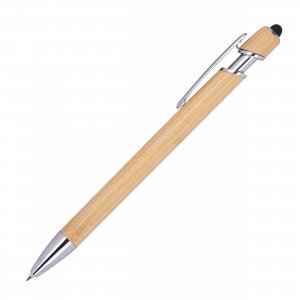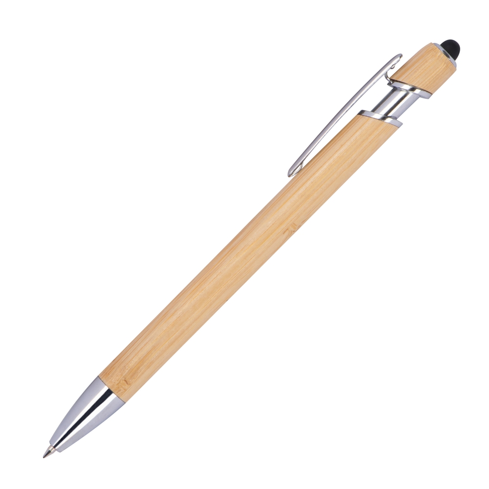 Artikel-Nr: EAG433213Kugelschreiber aus Bambus mit Touch-Pen. Der Kugelschreiber verfügt über silberne Kunststoffapplikationen sowie einen Metallclip und eine blauschreibende Kunststoffgroßraummine. Ihre Werbung bringen wir mittels einer Lasergravur am Schaft an.