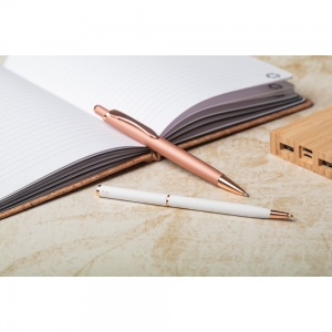 Artikel-Nr: AND809619-97Kugelschreiber aus recyceltem Aluminium mit gummierter Oberfläche und rosagoldenen Elemnten Mit Spezialbeschichtung für rosagoldfarbene Spiegelgravuren. Blauschreibend.