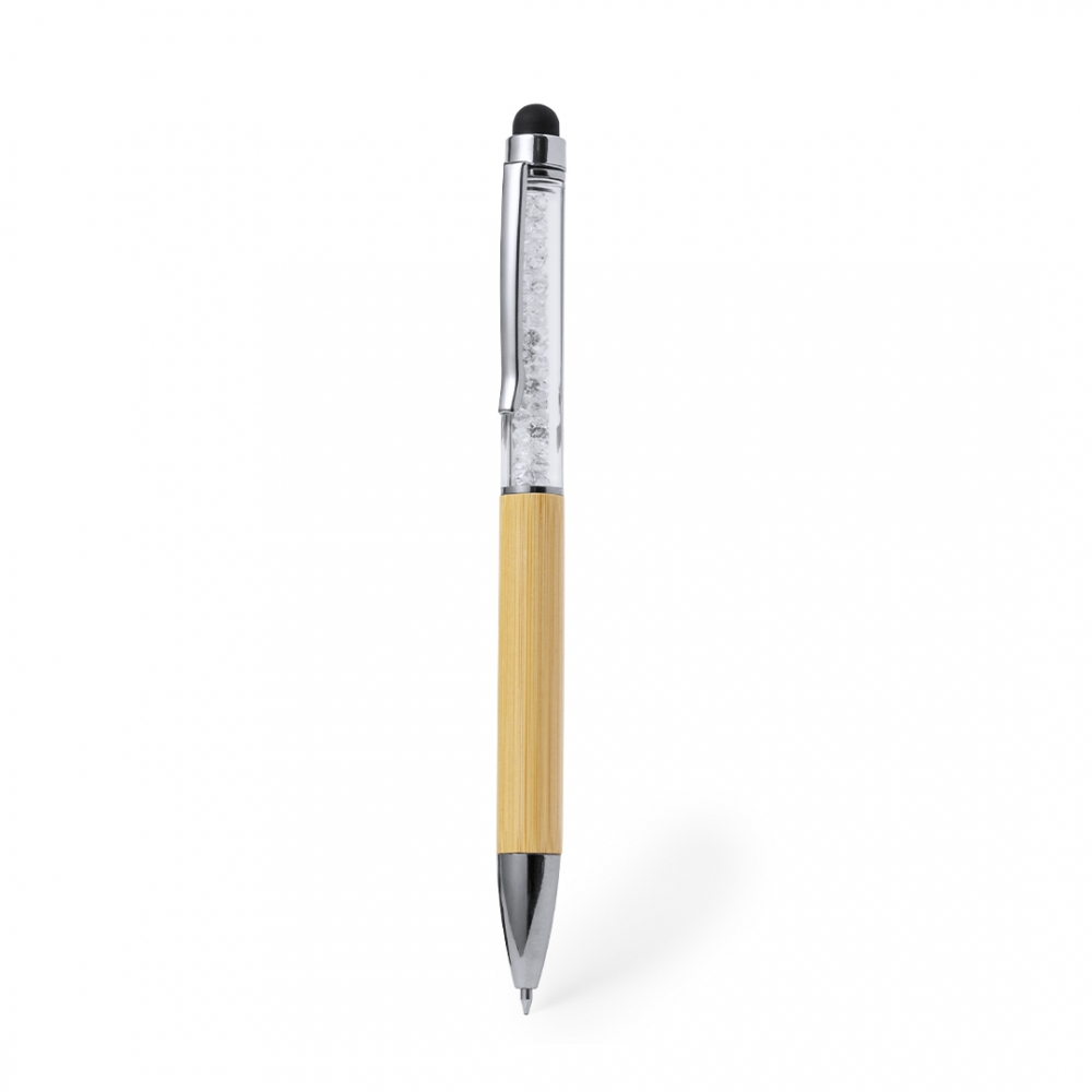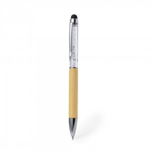 Artikel-Nr: KTO20651001000Eleganter Kugelschreiber mit Griff aus Bambus. Transparenter oberer Schaft mit 360°-Ansicht und rautenförmigen Kristallen im Inneren. Mit Metallclip und Details und Zeiger oben. Schwenkmechanismus und in blauer Tinte. Materialien wie Bambus fördern die Nutzung natürlicher Rohstoffe und reduzieren so den Schadstoffausstoß. Es stammt von einer äußerst widerstandsfähigen und vielseitigen Pflanze mit schnellem Wachstum und Regeneration, was es zu einer hervorragenden Alternative zur Verwendung von herkömmlichem Holz macht.