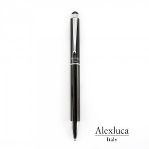 Artikel-Nr: KTO14406002000Dreh-Kugelschreiber mit Stylus von Alexluca. Mit angenehm weichem Metallschaft in elegantem Schwarz. Clip und Spitze in passender Farbe. Präsentiert in einem individuellen schwarzem Etui mit Markenlogo. Blaue Tinte.