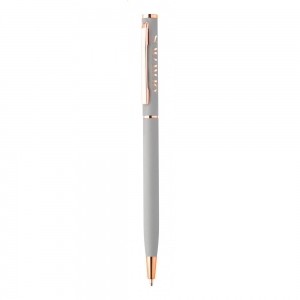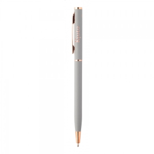 Artikel-Nr: AND809623-80Drehkugelschreiber aus recyceltem Aluminium mit gummierter Oberfläche und rosagoldenen Elementen. Mit Spezialbeschichtung für rosagoldenfarbene Spiegelgravuren. Blauschreibend.