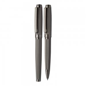 Artikel-Nr: AND806989Elegantes Schreibset aus Metall mit gemustertem Schaft. Blauschreibend. Das Set besteht aus Kugelschreiber und Rollerball. Einzeln in schwarzer Geschenkbox. Marke: André Philippe.