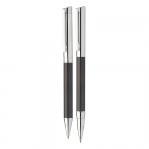 Artikel-Nr: AND806990Elegantes Schreibset aus Metall mit Carbon-Muster auf dem Schaft und verchromten Elementen. Das Set besteht aus Kugelschreiber und Rollerball. Blauschreibend. Einzeln in schwarzer Geschenkbox. Marke: André Philippe.