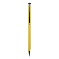Multifunktions-Kugelschreiber mit schlankem Profil und Stylus am oberen Ende für kapazitive Touchscreen-Geräte. Gehäuse mit Glanzoberfläche und Metallverzierung.