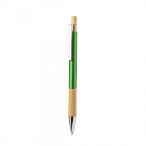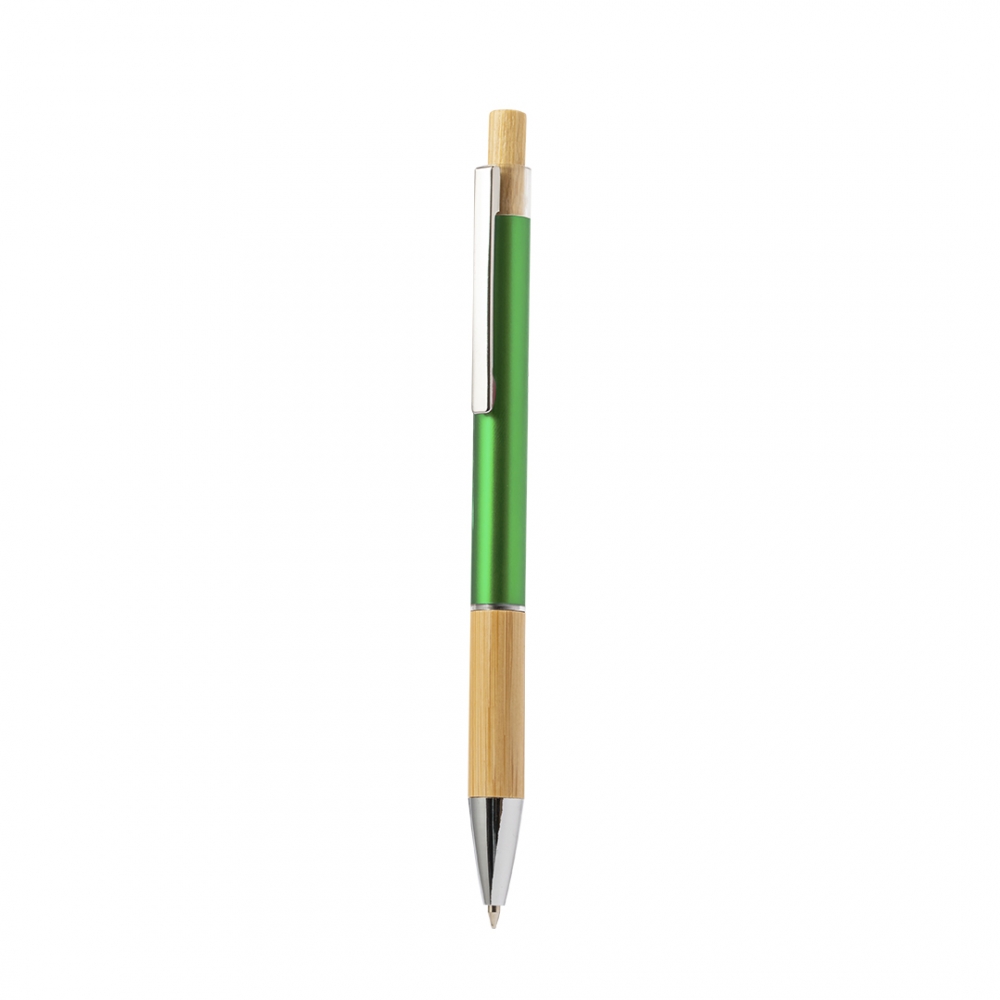 Artikel-Nr: KTO20654004000Stilvoller Kugelschreiber aus Bambus und Aluminium mit Druckknopfmechanismus. Robuster Aluminiumschaft mit glänzender Oberfläche und Bambusgriff, erhältlich in verschiedenen markanten Farben. Metallclip, mit Bambus-Druckknopf und blauer Tinte. Präsentiert in einem einzelnen recycelten Beutel. Materialien wie Bambus fördern die Nutzung natürlicher Rohstoffe und reduzieren so den Schadstoffausstoß. Es stammt von einer äußerst widerstandsfähigen und vielseitigen Pflanze mit schnellem Wachstum und Regeneration, was es zu einer hervorragenden Alternative zur Verwendung von herkömmlichem Holz macht.