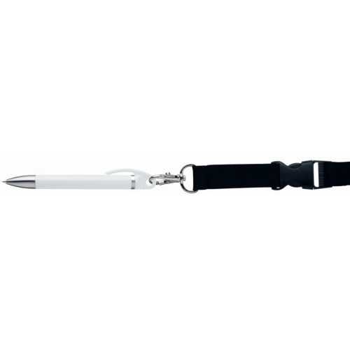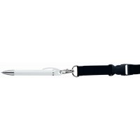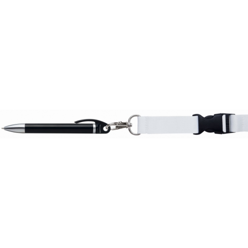 Artikel-Nr: 6020001500415Drehkugelschreiber mit schwerer, matt verchromter Metallspitze und Zierring. Schaft und Clip uni gedeckt schwarz oder weiß. An einem Lanyard (Umhängeband) mit Metallkarabinerhaken und Sicherheitsverschluss, der sich beim Ziehen öffnet.