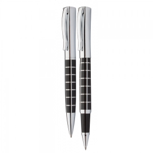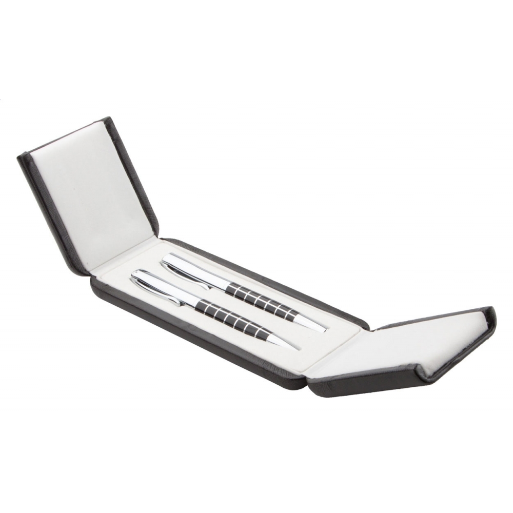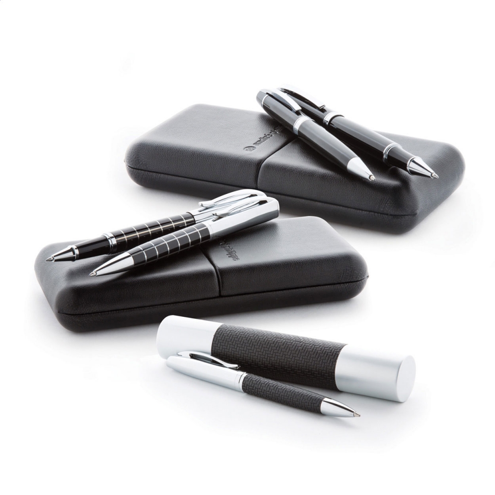 Artikel-Nr: AND805980Elegantes Metall-Schreibset mit verchromten Elementen, bestehend aus Kugelschreiber, blauschreibend, und Rollerball. Einzeln in Kunstlederetui. André Philippe Markenprodukt.