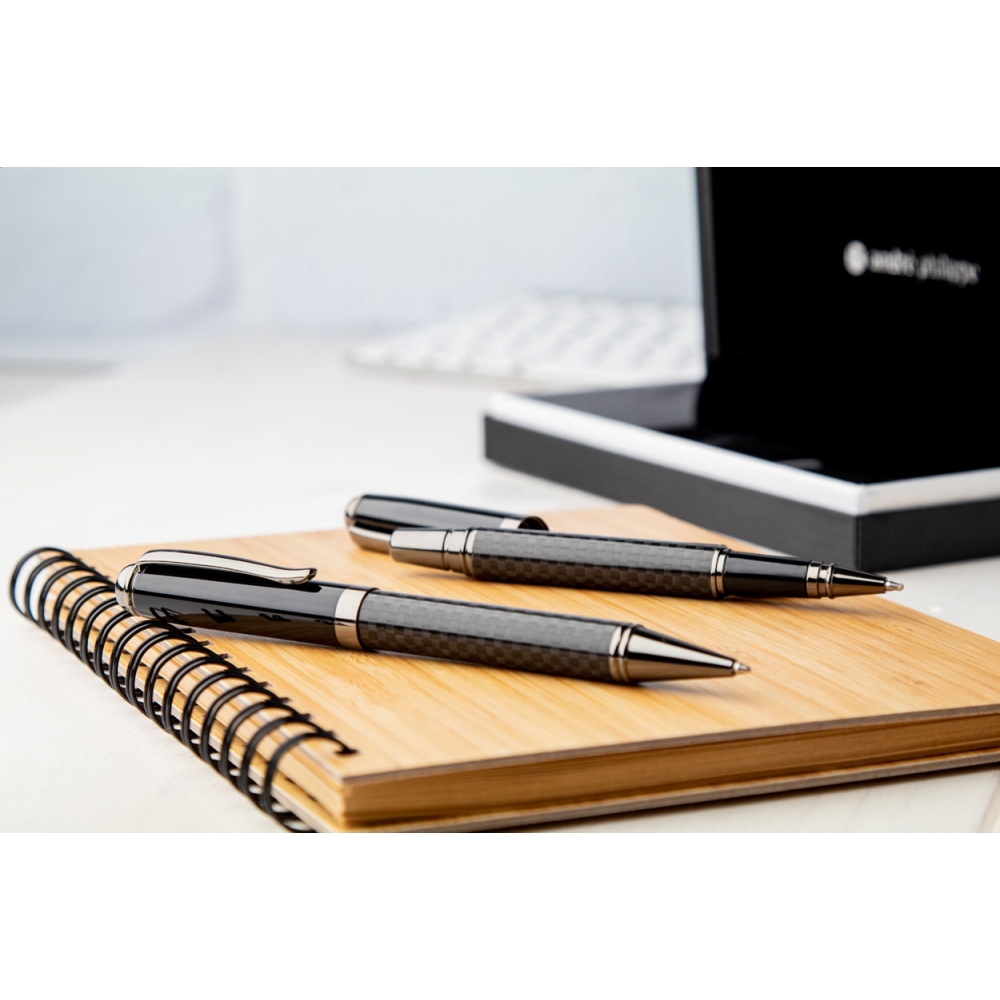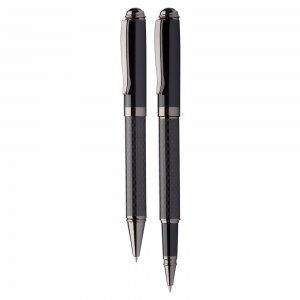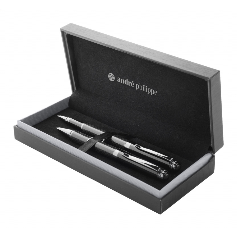 Artikel-Nr: AND805990Elegantes Metall-Schreibset, bestehend aus Kugelschreiber, blauschreibend, und Tintenroller. Einzeln in schwarzer Geschenkbox. André Philippe Markenprodukt.