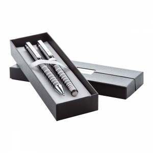 Artikel-Nr: AND805970Elegantes Metall-Schreibset mit verchromten Ringen, bestehend aus Kugelschreiber, blauschreibend, und Rollerball. Einzeln in schwarzer Geschenkbox. André Philippe Markenprodukt.