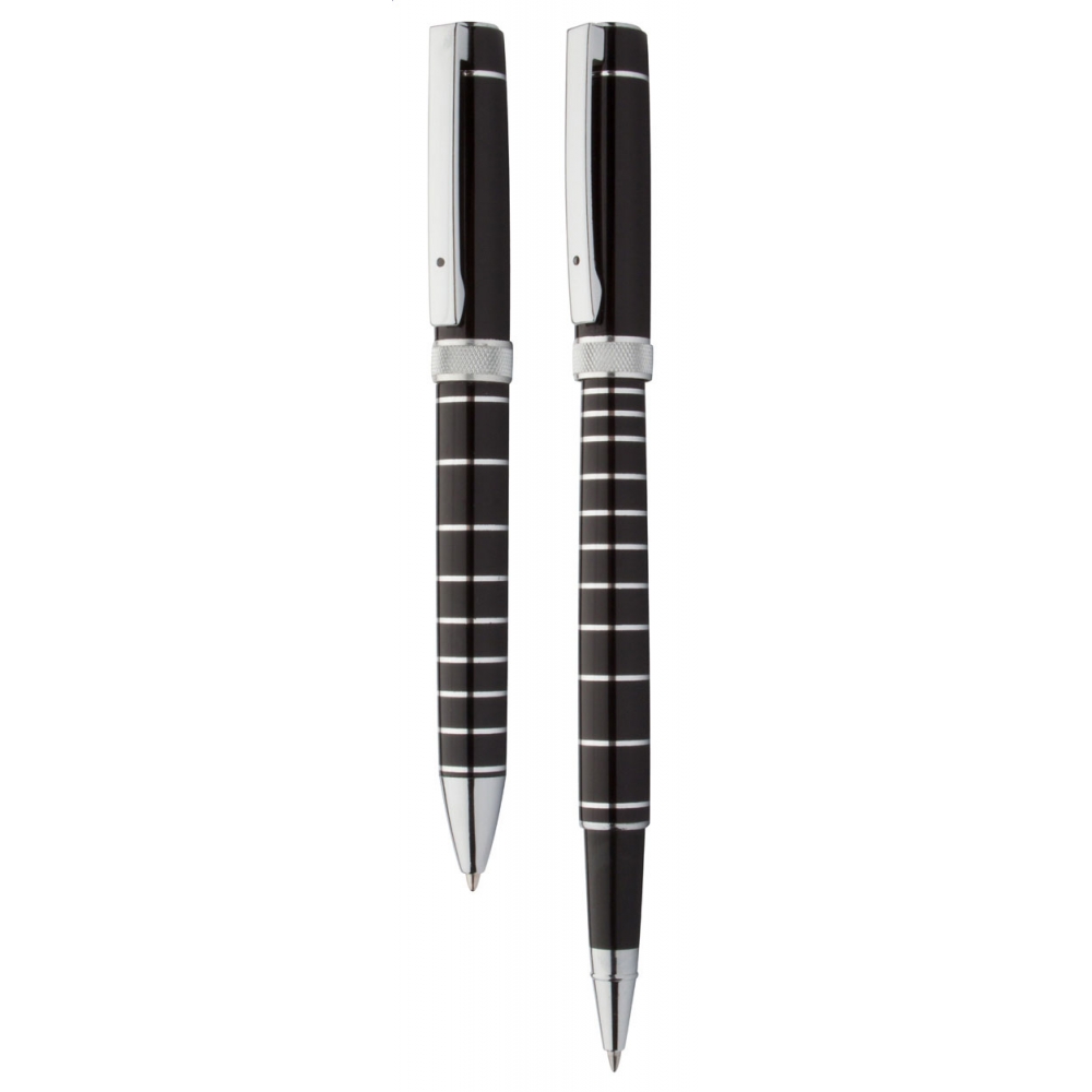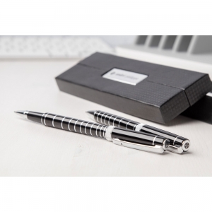 Artikel-Nr: AND805970Elegantes Metall-Schreibset mit verchromten Ringen, bestehend aus Kugelschreiber, blauschreibend, und Rollerball. Einzeln in schwarzer Geschenkbox. André Philippe Markenprodukt.