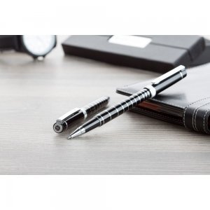 Artikel-Nr: AND805970Elegantes Metall-Schreibset mit verchromten Ringen, bestehend aus Kugelschreiber, blauschreibend, und Rollerball. Einzeln in schwarzer Geschenkbox. André Philippe Markenprodukt.