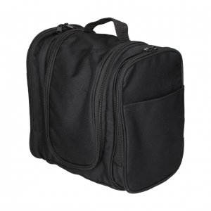 Artikel-Nr: ELT02094002-00000Schwarzer Kulturbeutel aus Polyester mit reichlich Platz. Der Kulturbeutel überzeugt mit einem großem Hauptfach, das fünf Netzfächern als auch ein oberes Netzfach mit Reißverschluss sowie Haken zum Aufhängen beinhaltet. Des Weiteren gibt es zwei weitere Außentaschen, die je ein weiteres Netzfach und integrierte Gummilaschen für z. B. Utensilien wie Zahnbürsten etc. enthalten. Der große Tragegriff am Kulturbeutel und die kleinen seitlichen Henkel, sorgen für einen angenehmen Tragekomfort.