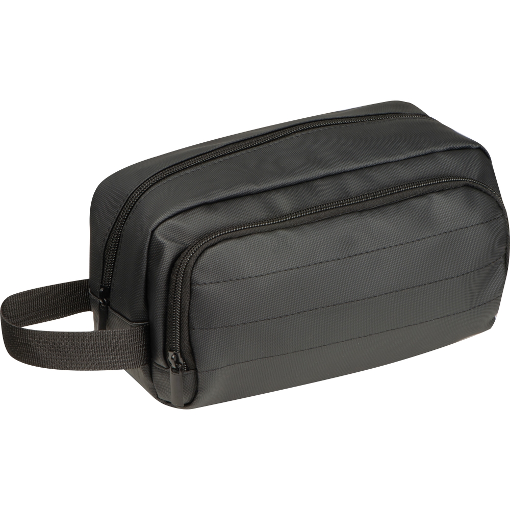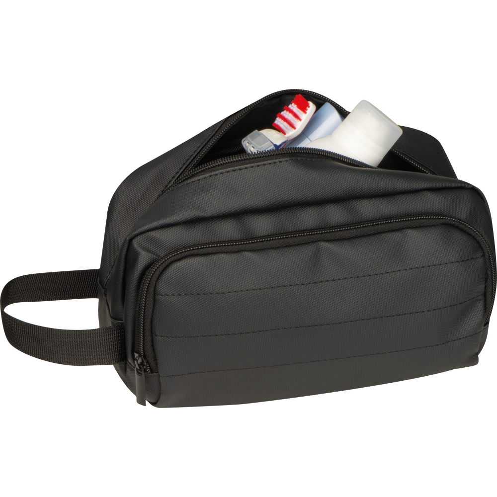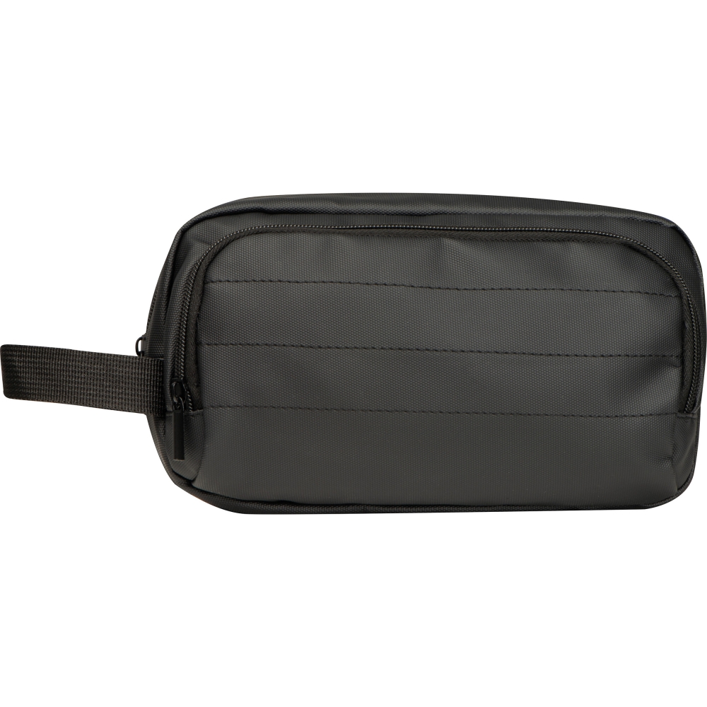 Artikel-Nr: EAG437103Hochwertige gepolsterte Kulturtasche aus Polyester mit PU-Beschichtung. Sie hat neben dem Innenfach mit Reißverschluss noch ein Reißverschlussvorfach sowei eine Trageschlaufe. Robust und wasserabweisend, perfekt für Reisen und den täglichen Gebrauch. Ihrer Werbung drucken wir auf den Kulturbeutel.