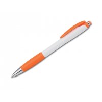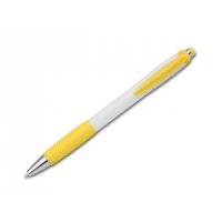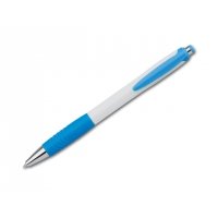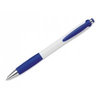 Kunststoffkugelschreiber mit Gummigrip und blauschreibender Mine.