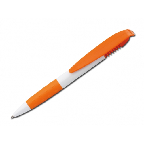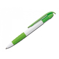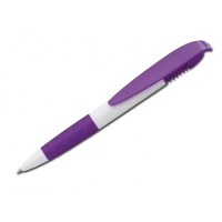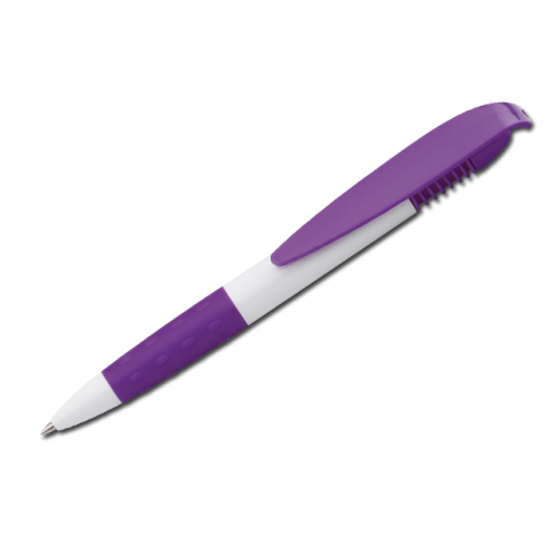 Kunststoffkugelschreiber mit Gummigrip und blauschreibender Mine.