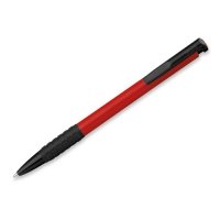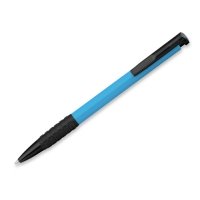 Kunststoffkugelschreiber mit Gummigrip und blauschreibender Mine.