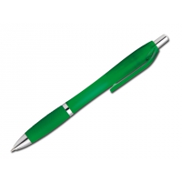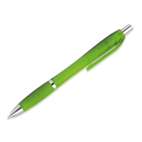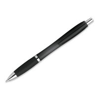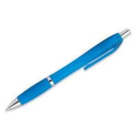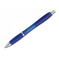 Kunststoffkugelschreiber mit Gummigrip und blauschreibender Mine.